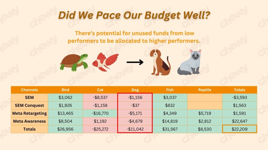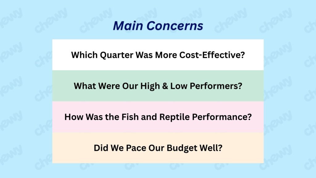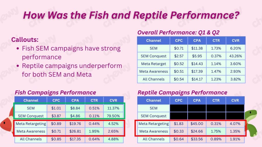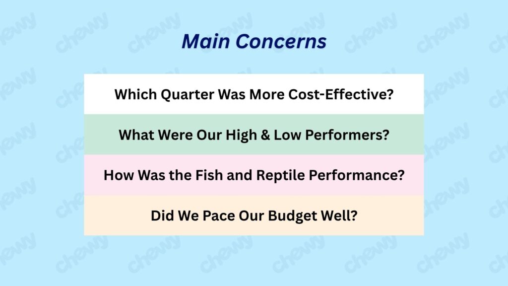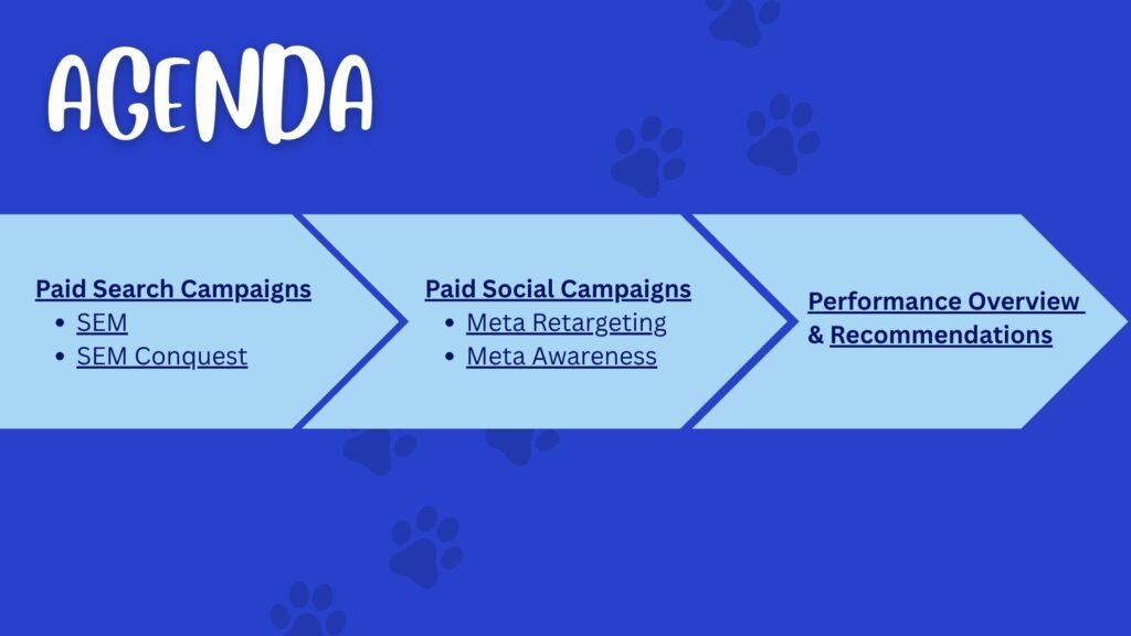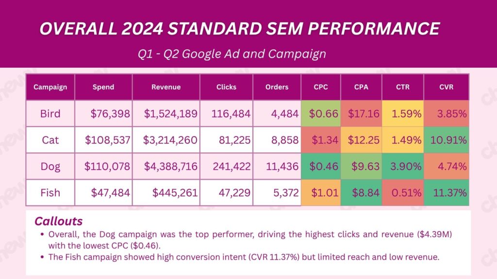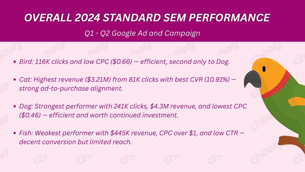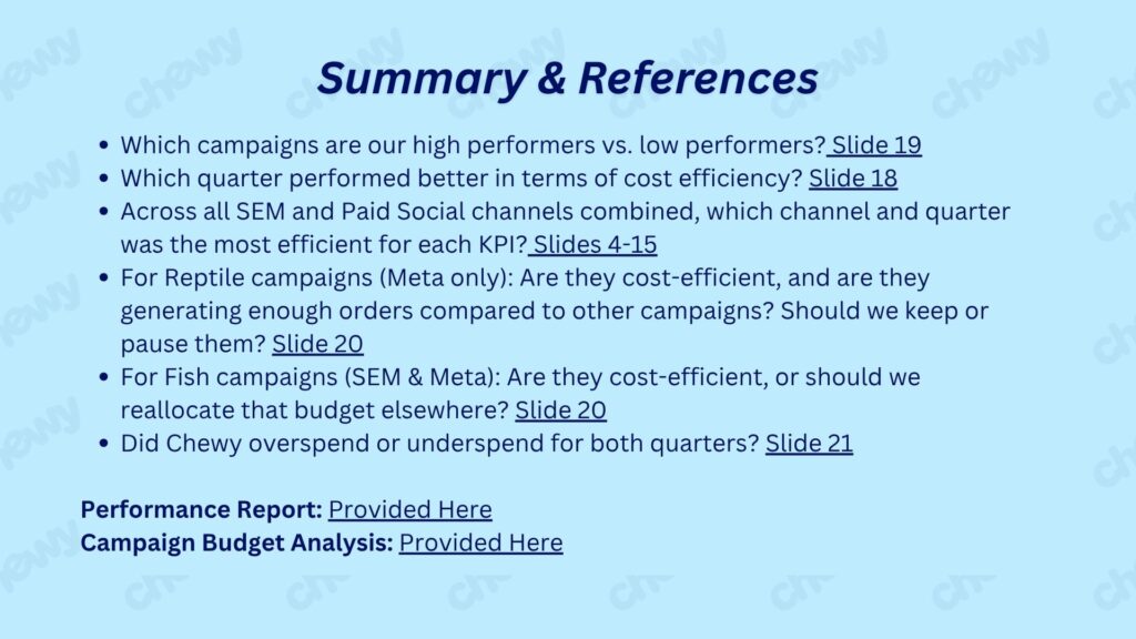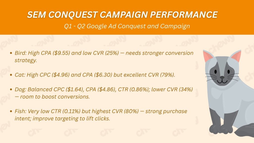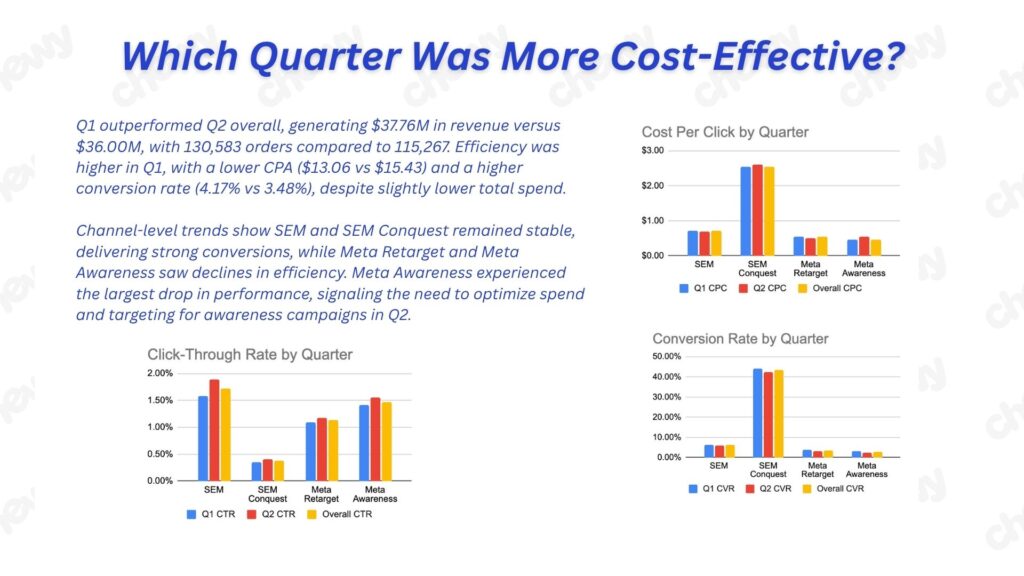 For our first digital marketing collaborative project, we were tasked with creating a performance report and presentation based on marketing data analysis. Our mock client, Chewy, provided Q1 and Q2 2024 marketing data for review. The goal was to analyze and present key insights to Jenna, a new team member at Chewy, to help her understand the account’s performance across SEM and Paid Social channels. The deliverables included a detailed Excel performance report and a presentation highlighting overall trends, channel efficiency, and campaign-level recommendations.