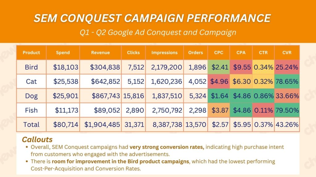 Working in a group of four, each team member was responsible for leading a portion of the data analysis and final deliverables. My role was Performance Reporter, where I developed the overall structure of the performance report and determined which graphs and charts best represented the client’s requested metrics. For my analysis, I focused on the SEM Conquest data, extracting key insights and identifying trends to inform recommendations for campaign optimization.